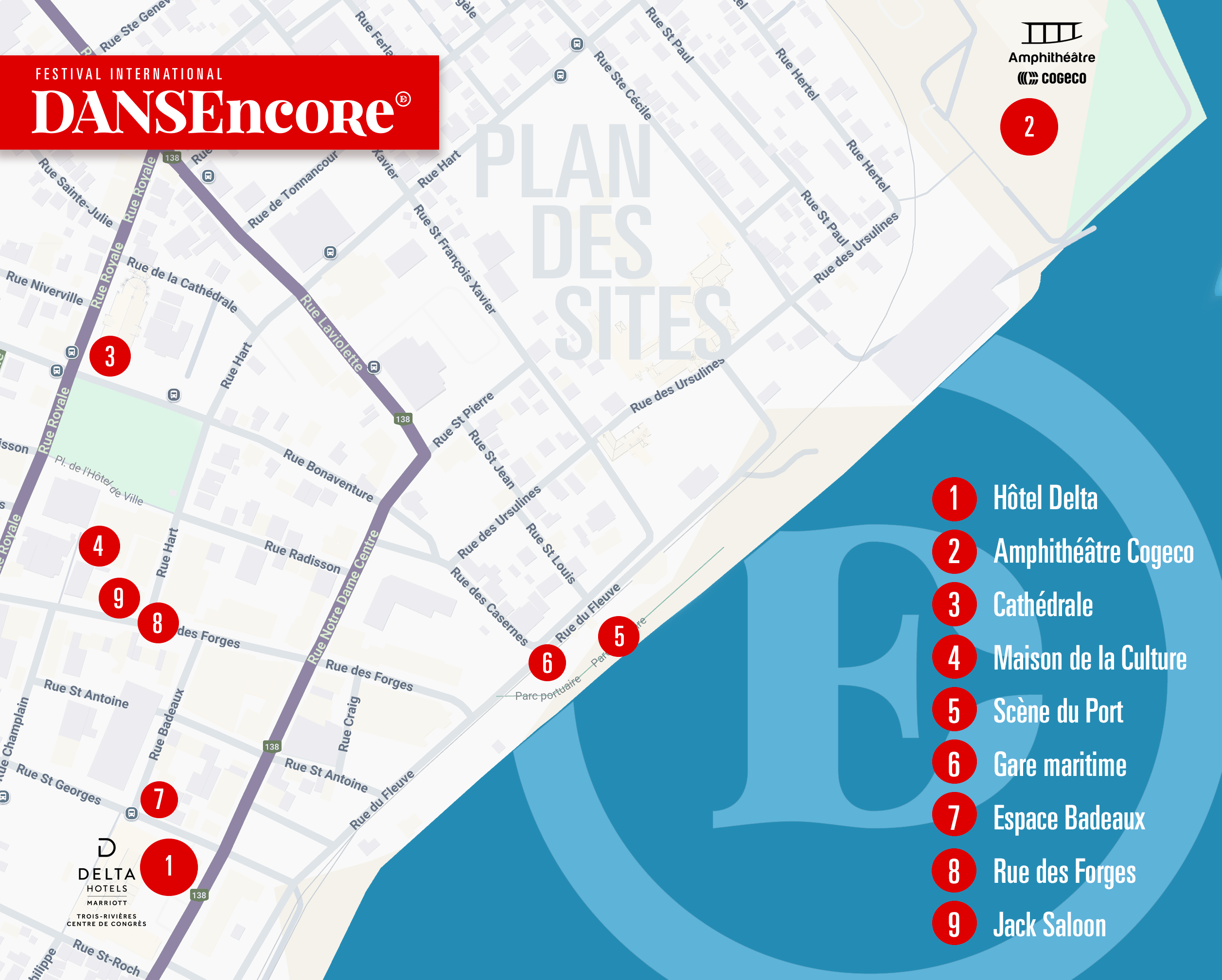 Vivez le Festival International DANSEncore au CŒUR du centre-ville de Trois-Rivières. En tant que Festival piéton, vous pouvez facilement circuler d’un site à l’autre (moins de 1 km) et ainsi profiter de l’ensemble de la programmation.